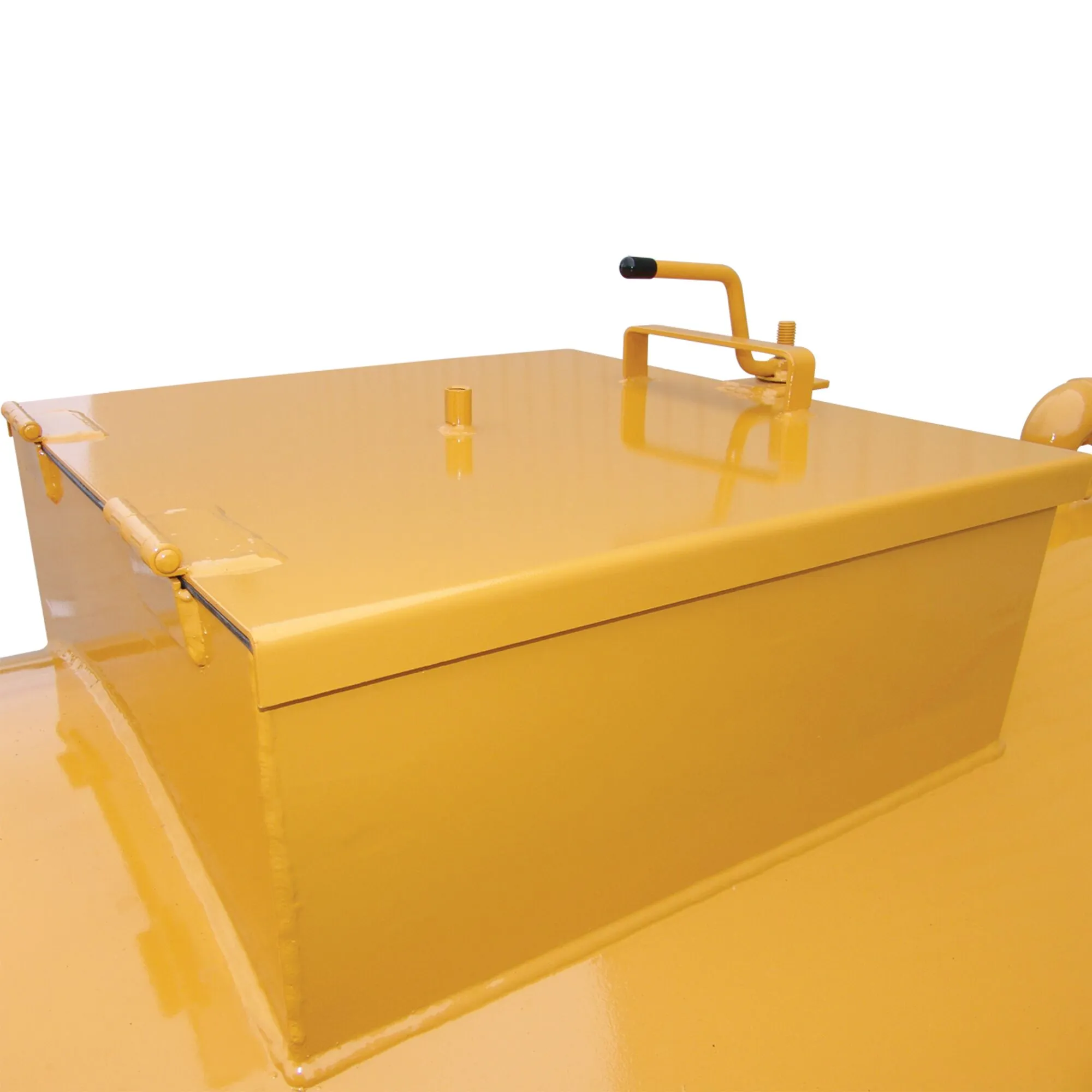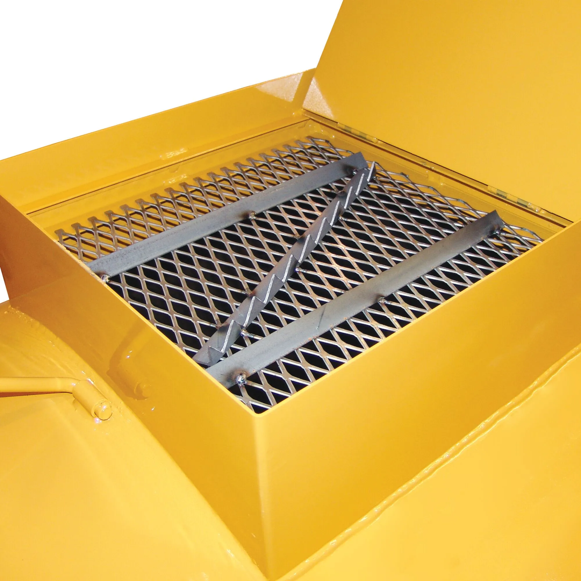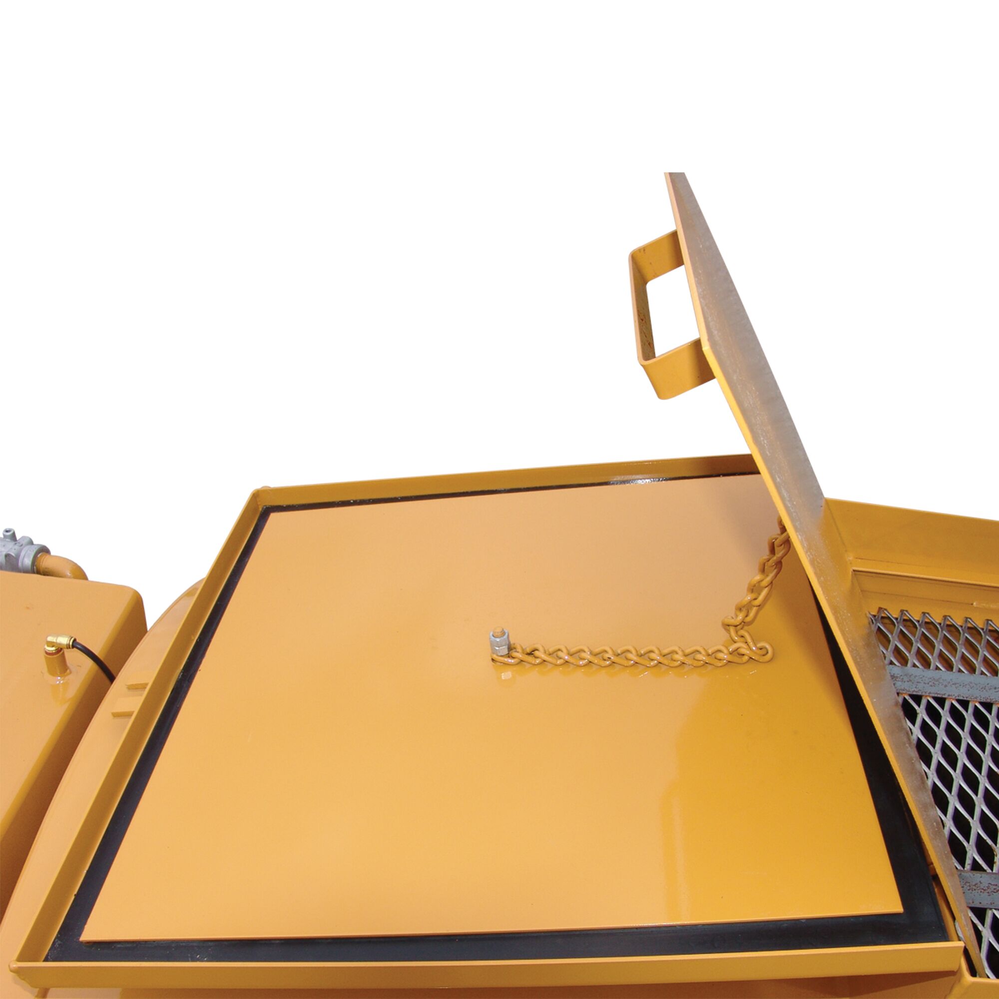 25″ Gasketed Manway with Lockable Outer Lid, Inner Splash Lid, Safety Sand Grate with Bag Splitter, 4 Hinges, 1 Tie Down, 2 Handles, 1 Chain and 1 Nut & 1 Bolt. (some cutting and welding required) (unpainted & unassembled)