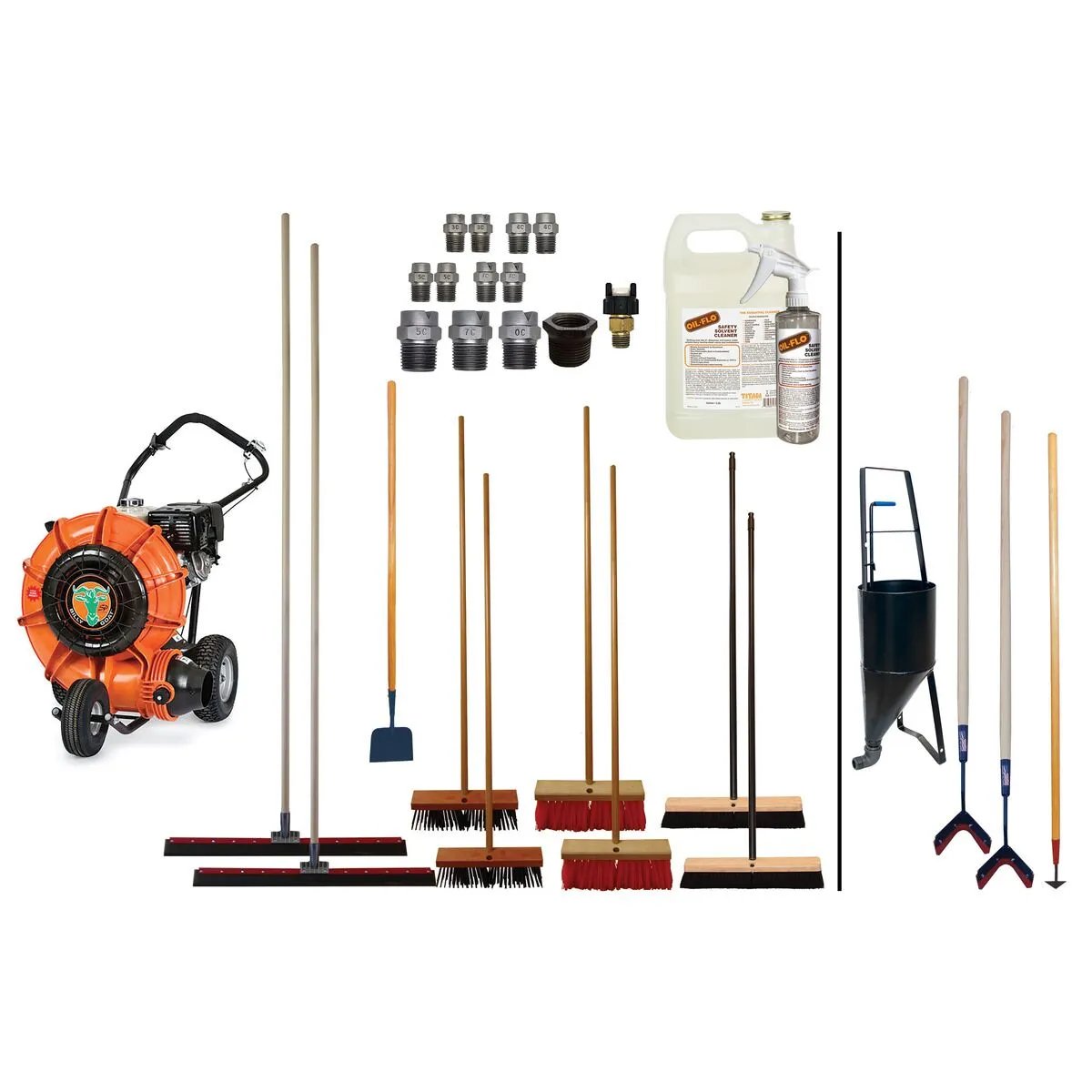 The Basic Essentials Kit provides the core tools and equipment you need for efficient, professional sealcoating work. It comes complete with a Billy Goat Force Blower with Honda GX390, scraper, squeegees, brooms, spray tips, and an Oil Flo Safety Solvent Kit. Everything is selected to help you work cleaner and faster. Built with durability in mind, this kit saves you 10 percent compared to purchasing parts individually and ensures you are ready to tackle essential sealcoating projects with confidence.